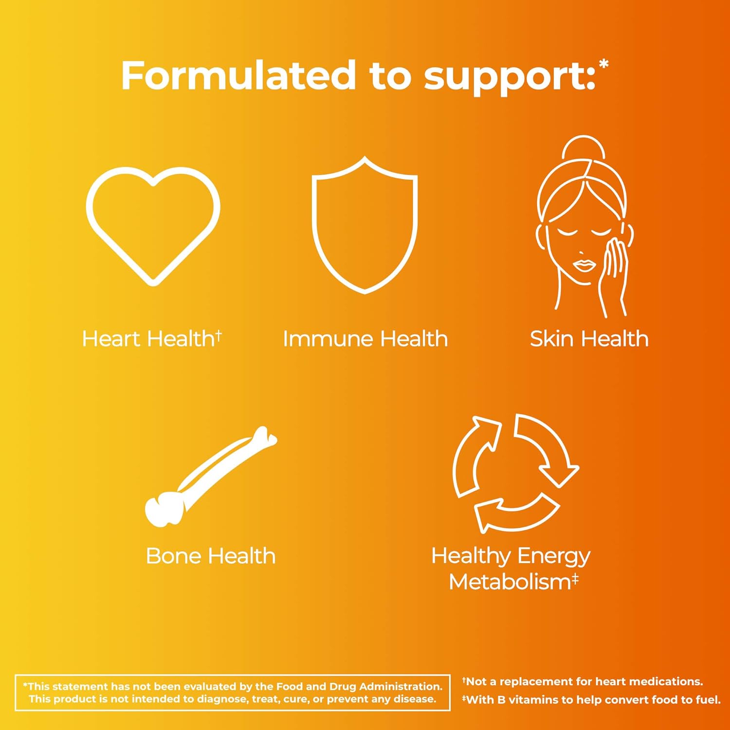Formulated to support: Bone health, immune health, skin health, heart health, and physical energy by helping convert food to fuel